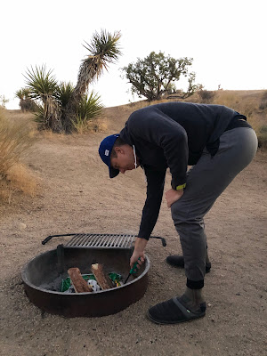 We sipped and stargazed for another few hours, listening to the "Joshua Tree - Chill" playlist I'd compiled at home (streaming it from my phone to Arlene's speakers) and singing along with the hits (FYI - they were all bangers, naturally). Eventually, we tuckered out, so we broke up the campfire and ensured it was safely winding its way down before retiring to Arlene. We quickly found out we should have closed the camper windows MUCH earlier in the evening, as it was freaking freezing in there; we booted up the heater, which quickly set off the CO detector, and we danced around our small space, running the vent fan while wildly flapping papers at the detector to get it to stop. I bet our neighbors loved us (all of this was happening before 9pm, so I can't imagine they were too bothered). We crawled in bed wearing most of our clothes and finally stopped shivering enough to fall asleep.