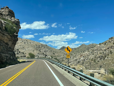 We made it to and through northern Tucson without any trouble, and we started the hike up the mountain. Mt Lemmon tops out at 9,100 feet, and Tucson is around 2,300, so we had some climbing to do. The road twists and turns, and you get all sorts of great views of the metro Tucson area and surrounding scenery as you head up or down.